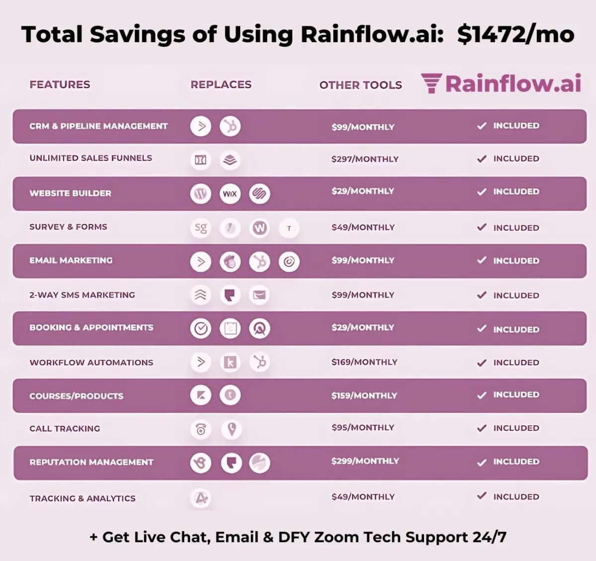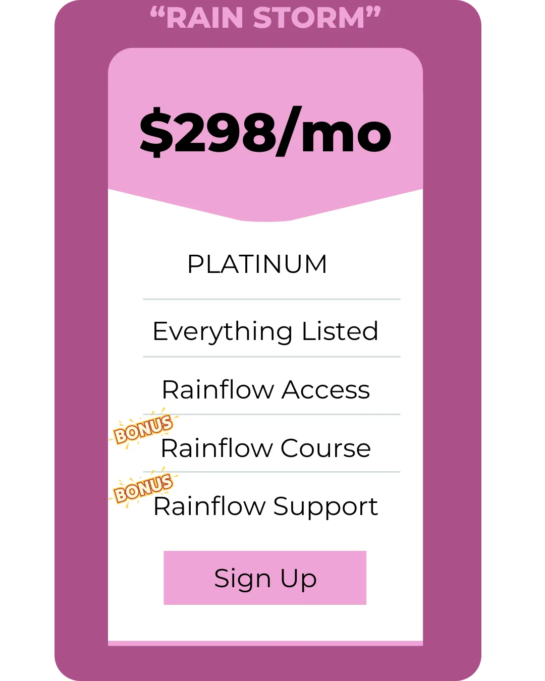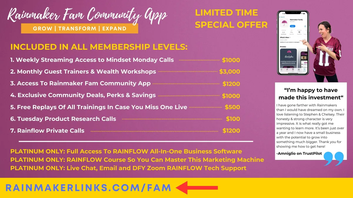 If you want everything above, our GOLD plan is the way to go. If you would like to have access to RAINFLOW, our all-in-one marketing software, then you'll want to go PLATINUM. The PLATINUM plan comes with access to RAINFLOW, access to a RAINFLOW course, and access to a premium tech support concierge to help you implement the software. You can hear more about RAINFLOW and everything it can do (and save you) in the overview video, skip to 31min.
